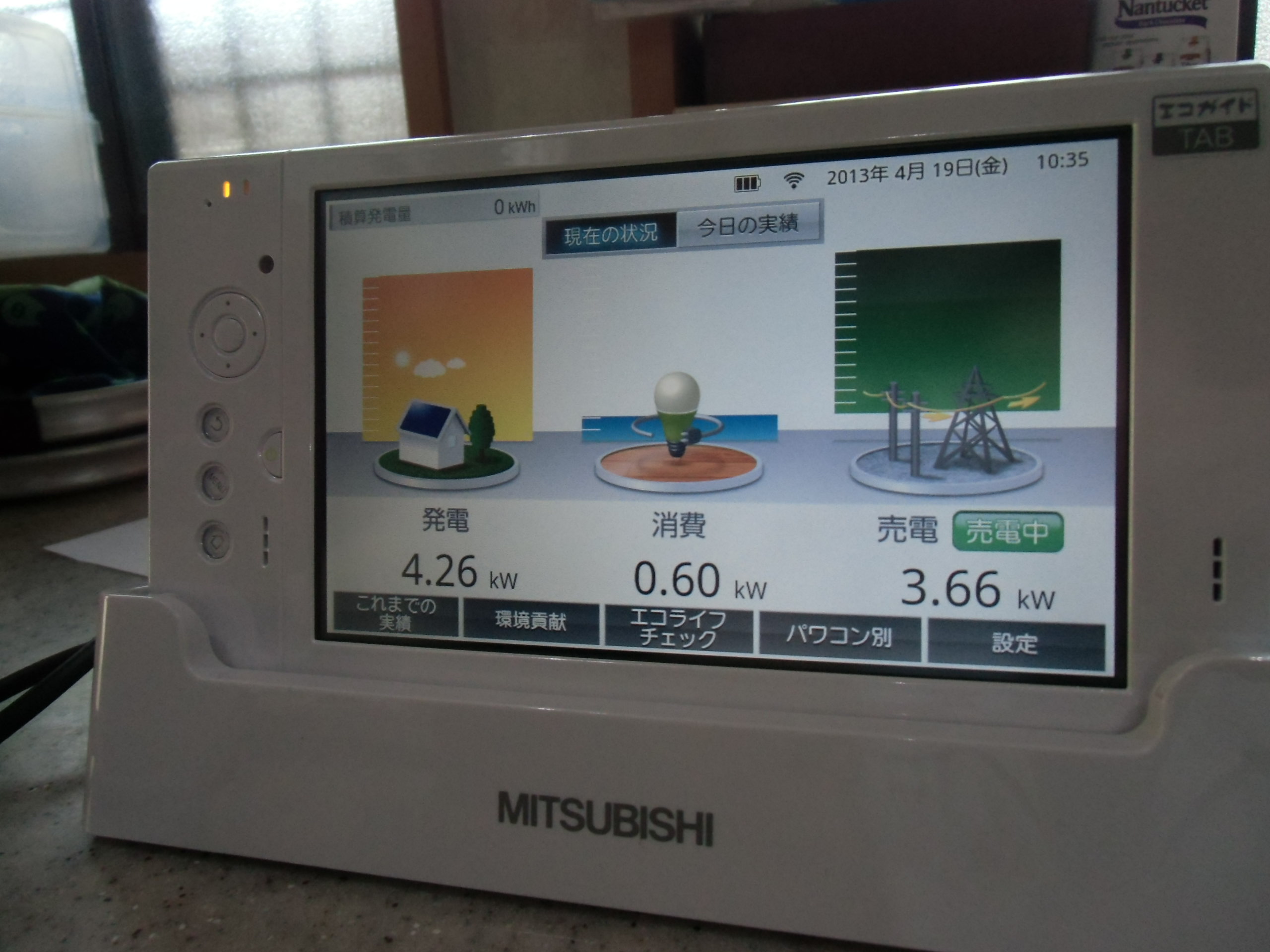 オール電化, リフォーム関連, 一口メモ, 住宅用【太陽光発電】, 実例施工, 自然エネルギー関連 2013年4月19日【表示ユニット】【充電台】設置で、TEST画確認にて施工ご依頼主さまへのご説明と質疑応答を丁寧に対応です。