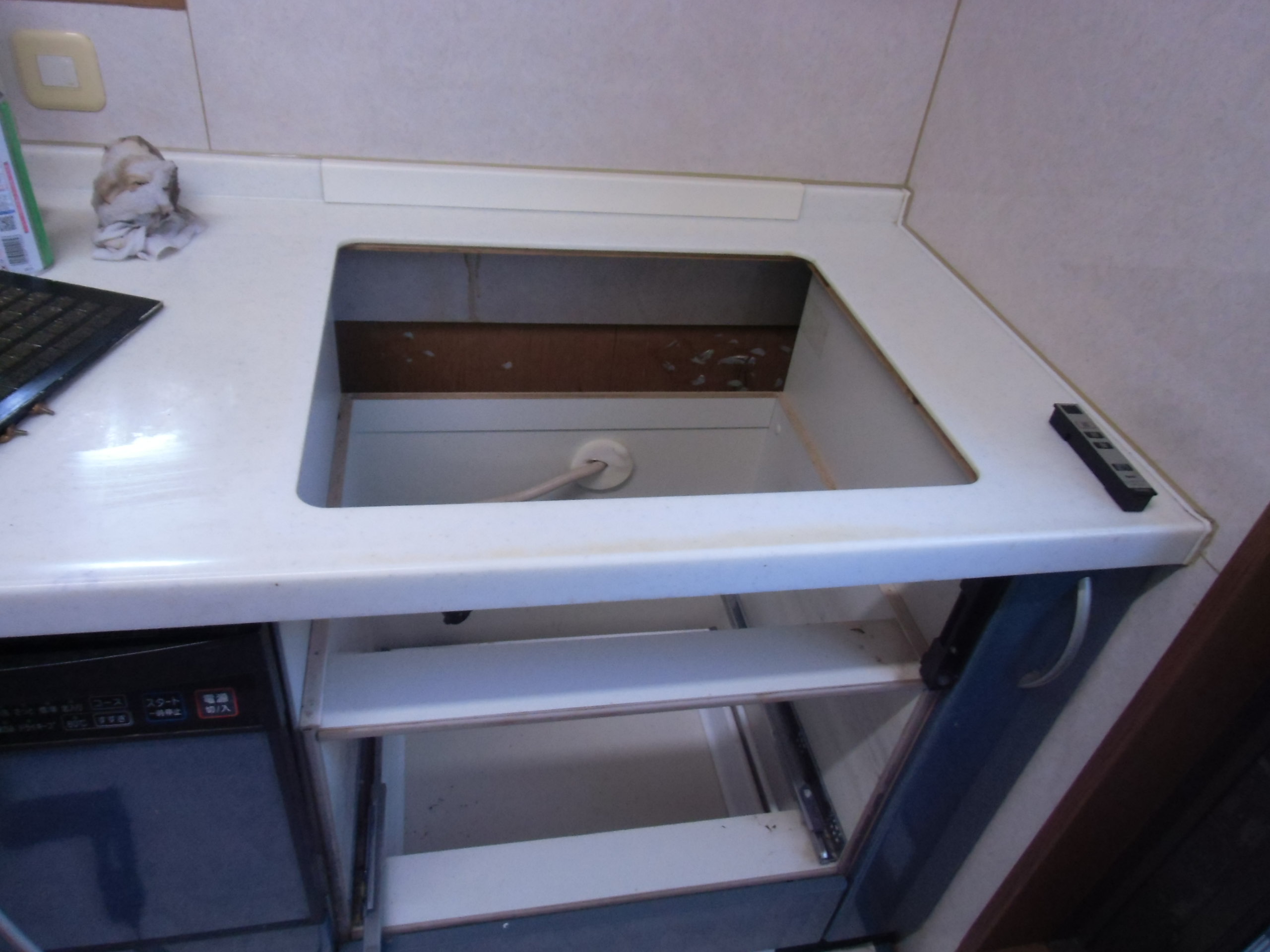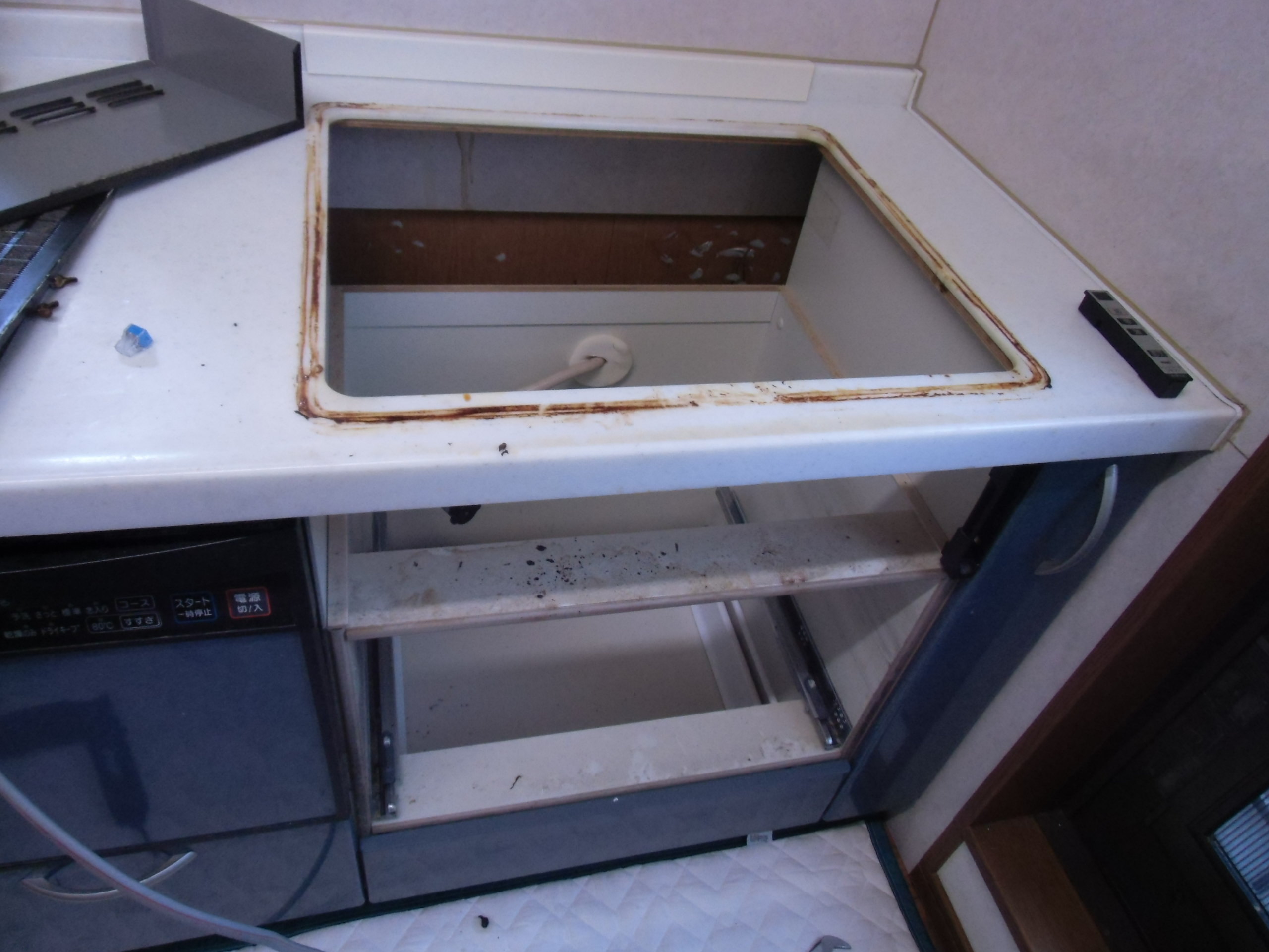 コンロ台撤去⇒清拭作業へ コンロ台周辺の