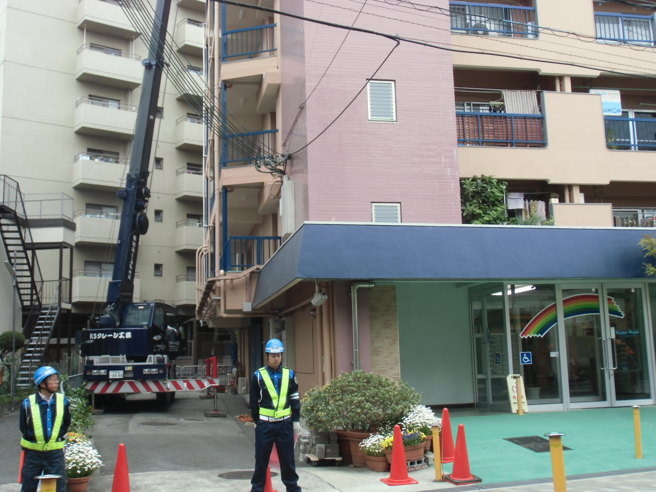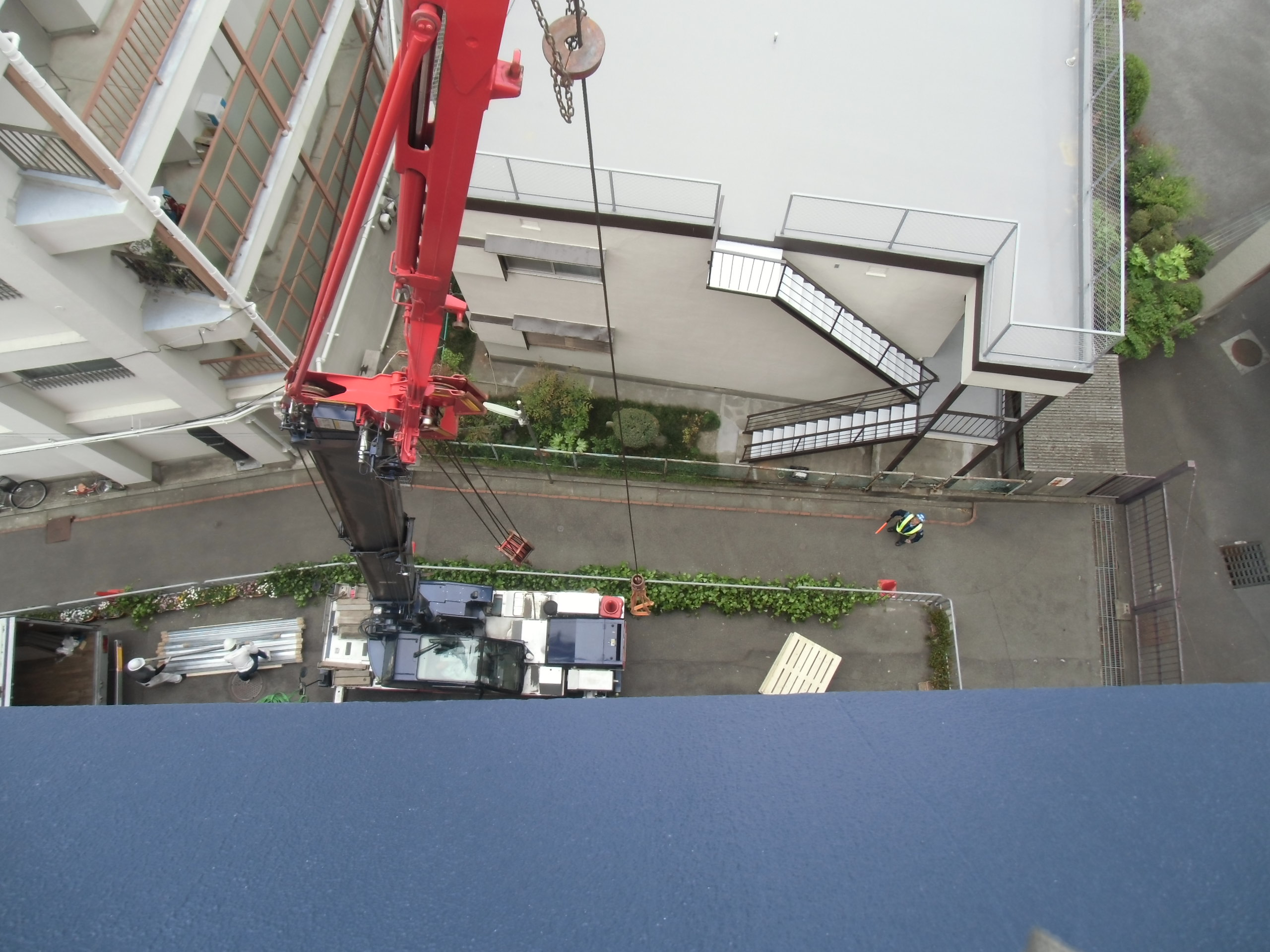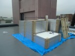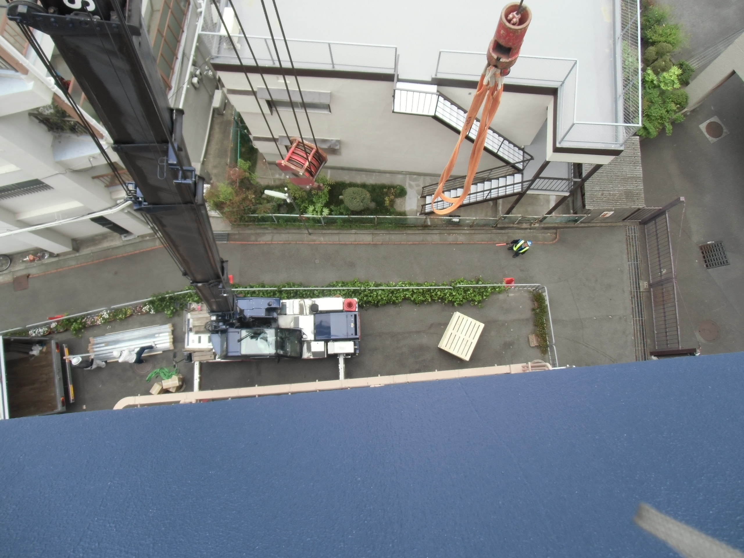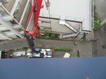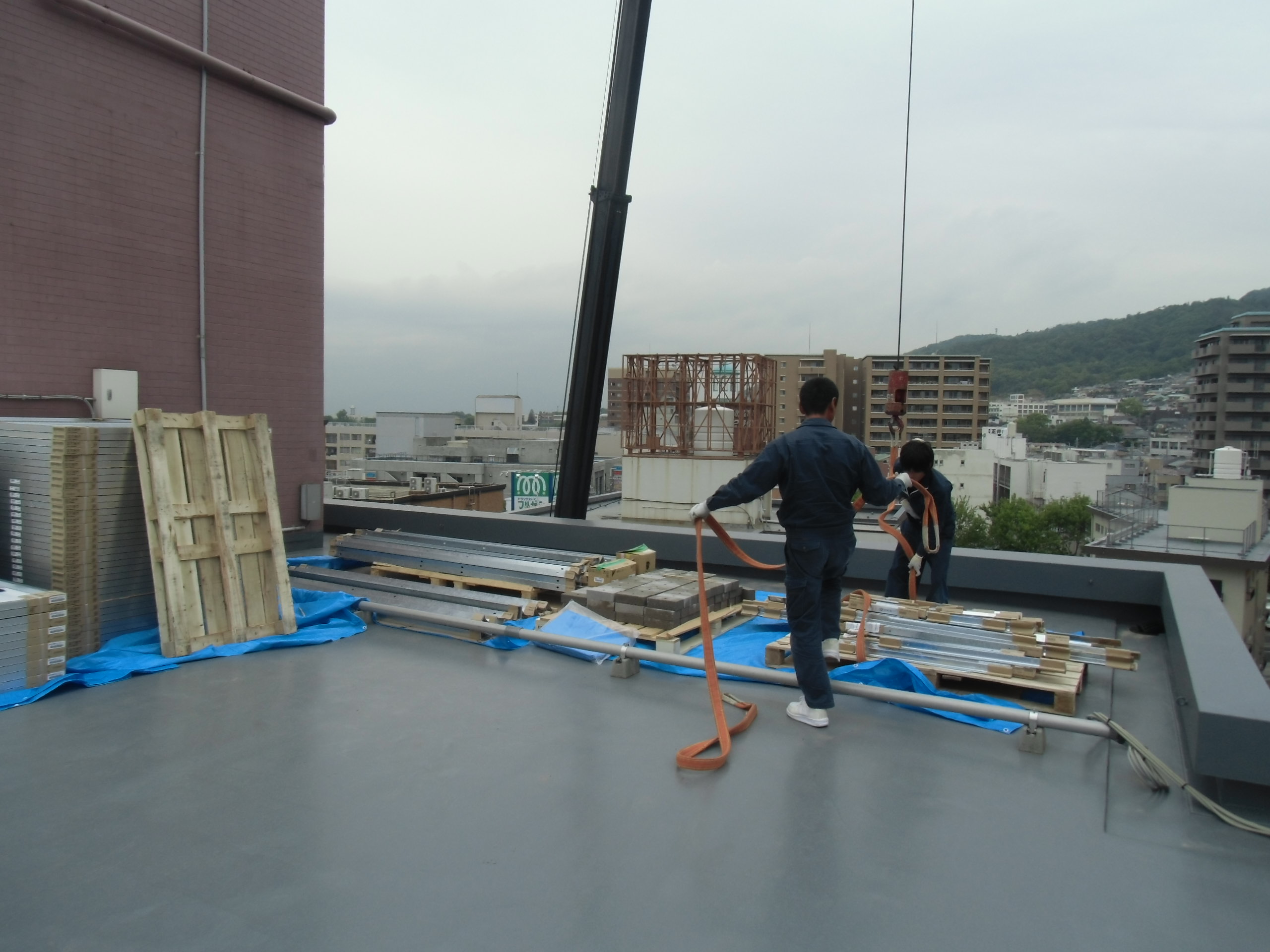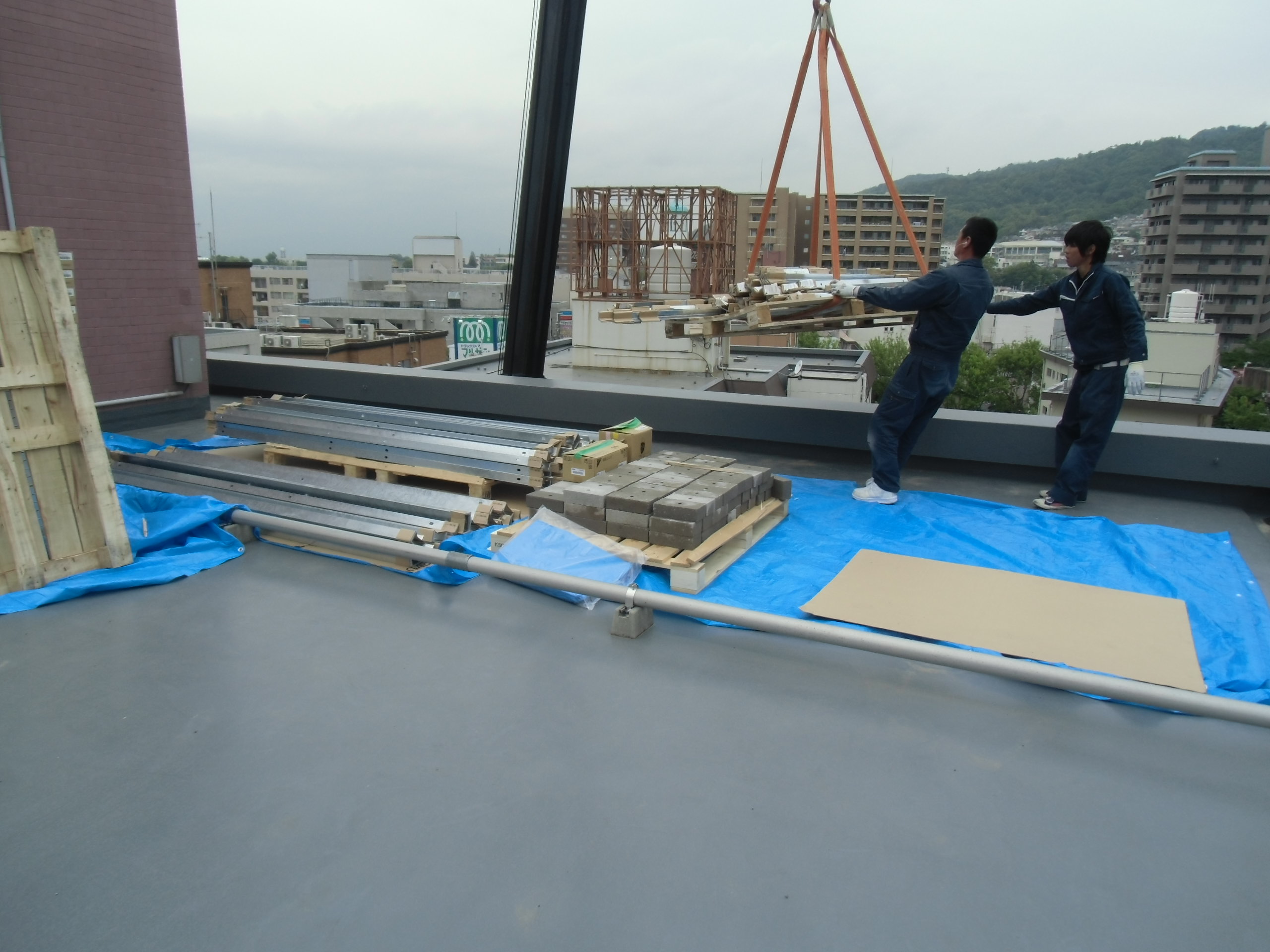 屋上へ機材搬入開始時は、お天気