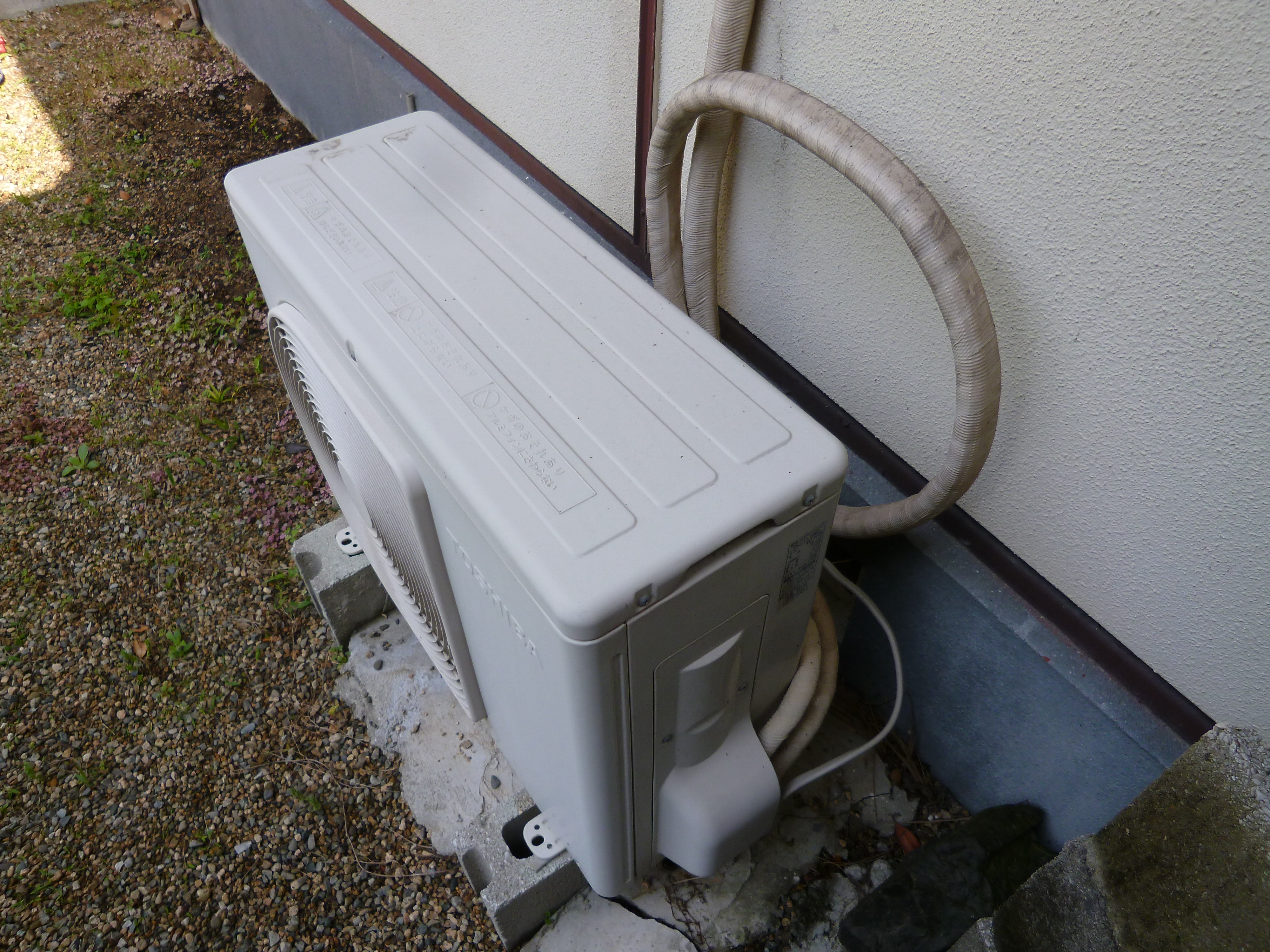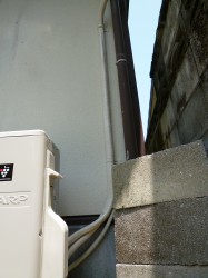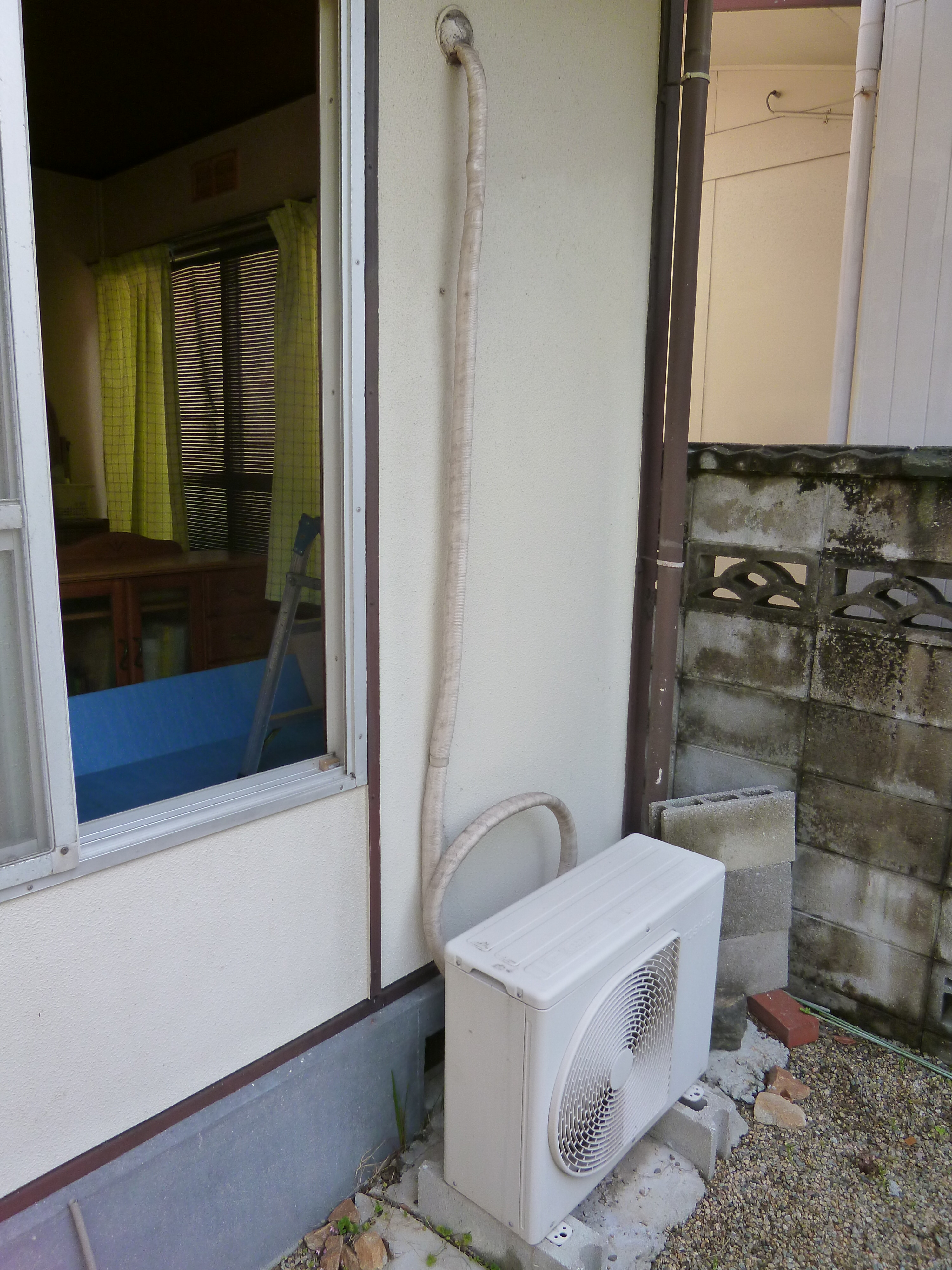 旧エアコン室外機です。パイプが、ぐるっとまわってとりつけてあります。
