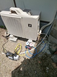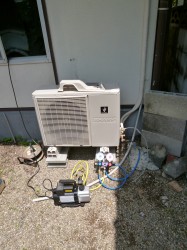 真空ポンプを使ってパイプ内の真空引き作業です。この作業は。パイプ内を真空状態にして、余計な水分を乾燥させガスを送ります。