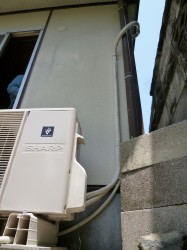 今回はテープ巻きで、パイプをはわせ かつ パイプをぐるっとまわさないで室外機に接続です!