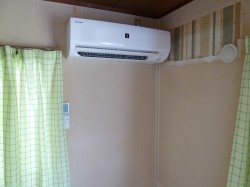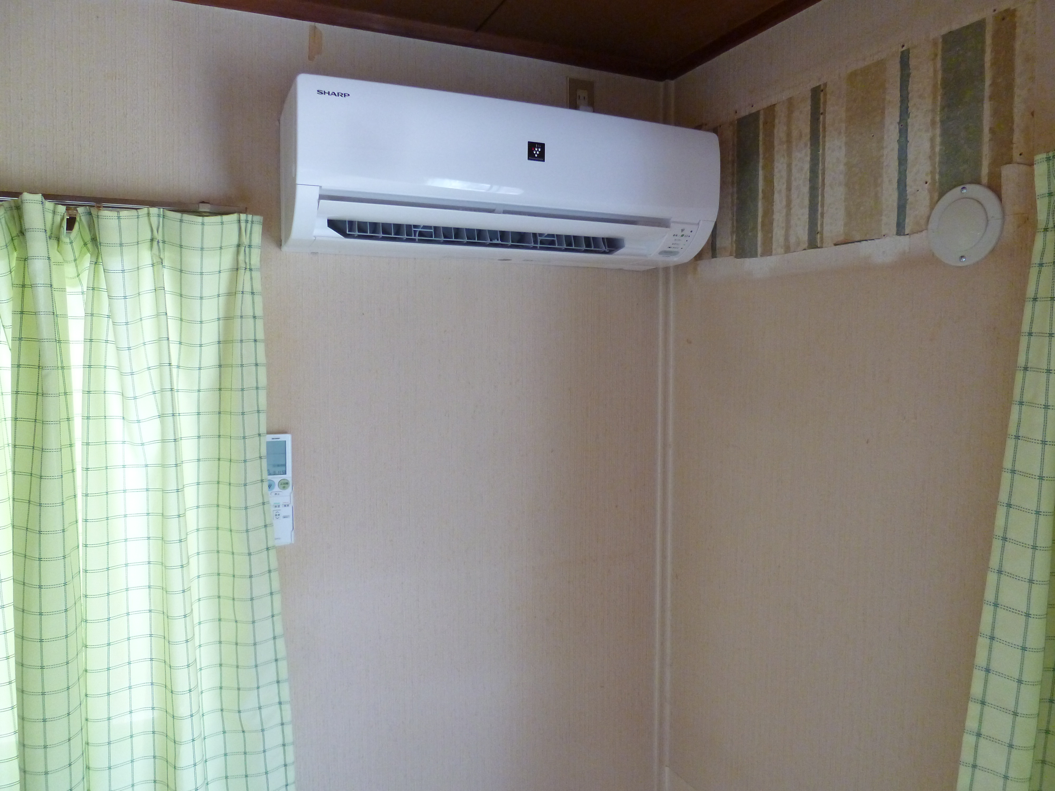 内機の位置を左窓横に設置します。、直に冷気、暖気の気流をベッドにあてないようにする為です。