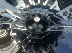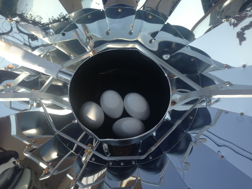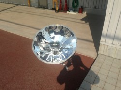 ソーラークッカーです。太陽の光を集熱しお鍋を熱します。(ワクワク)
