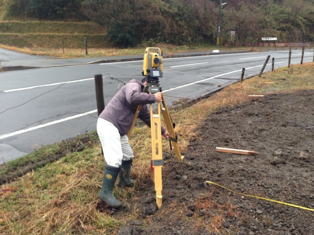 土地が少し道路なりに湾曲しておりますので、測量をしパネル配置のポイント出しから始まります。