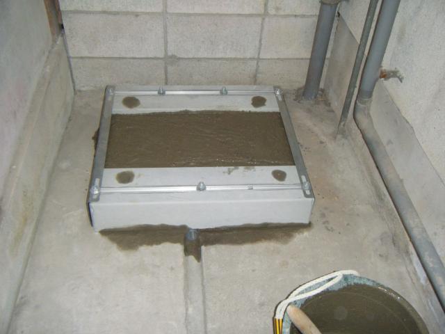 dscf5627.JPG dscf5628.JPG 真ん中の溝に向かって勾配のついた土間にエコベースを設置するのですが、まずエコベースが水平に据えられるように高さ調整します、そして溝に流れる水をせき止めないようパイプを通しました。