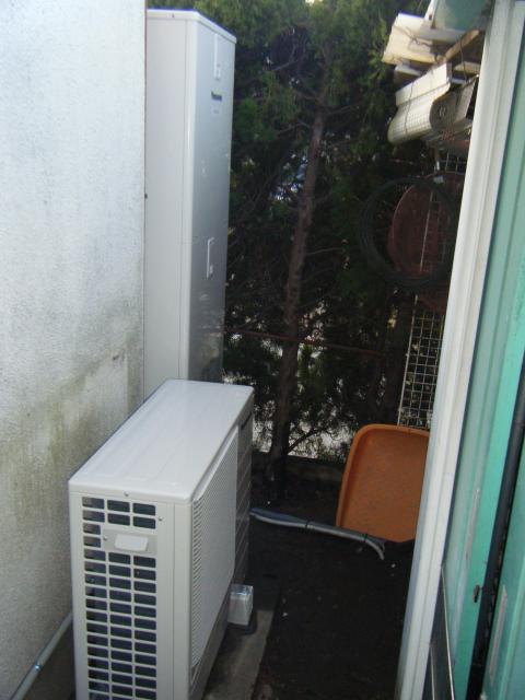 施工完了・・・エコキュート本体、ヒートポンプ(エアコン室外機みたいなのです)を配管接続し試運転して完了です。