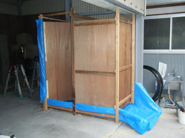 少しづつ、形になってきました。壁材で使用させていただいてるコンパネは施主様からお借りしました。足元の排水がなかなかうまく勾配取れなく苦労しました。ブルーシートで簡易にしております。