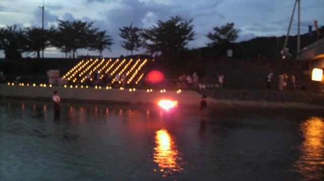 夕暮れの気持ちのいい風が吹く中、川べりで灯篭流しをしています。