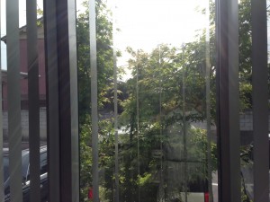 会社の窓から見える木漏れ日、新緑のように、