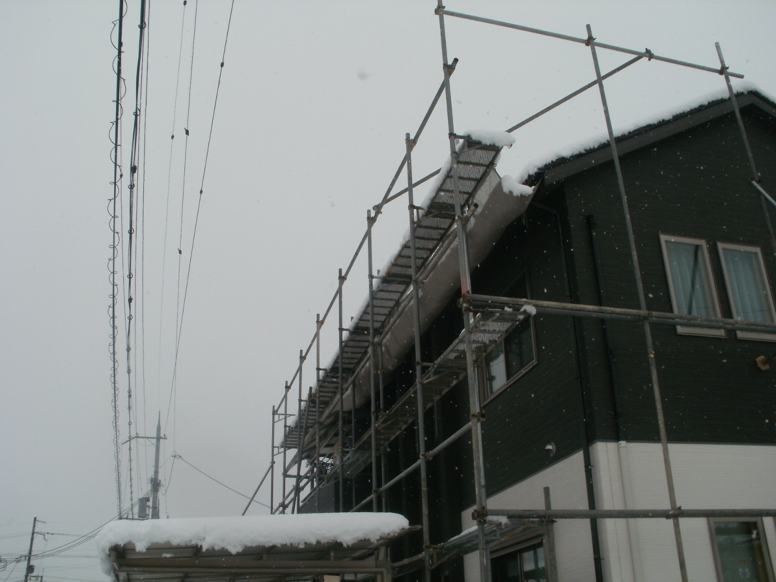 H様は現在、足場を設置した状態です、この雪で本日の工事は延期でした。