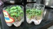 カイワレはわがやでスクスク。左が炭バクチャー入りです。なしより大きく育ってます(^^)