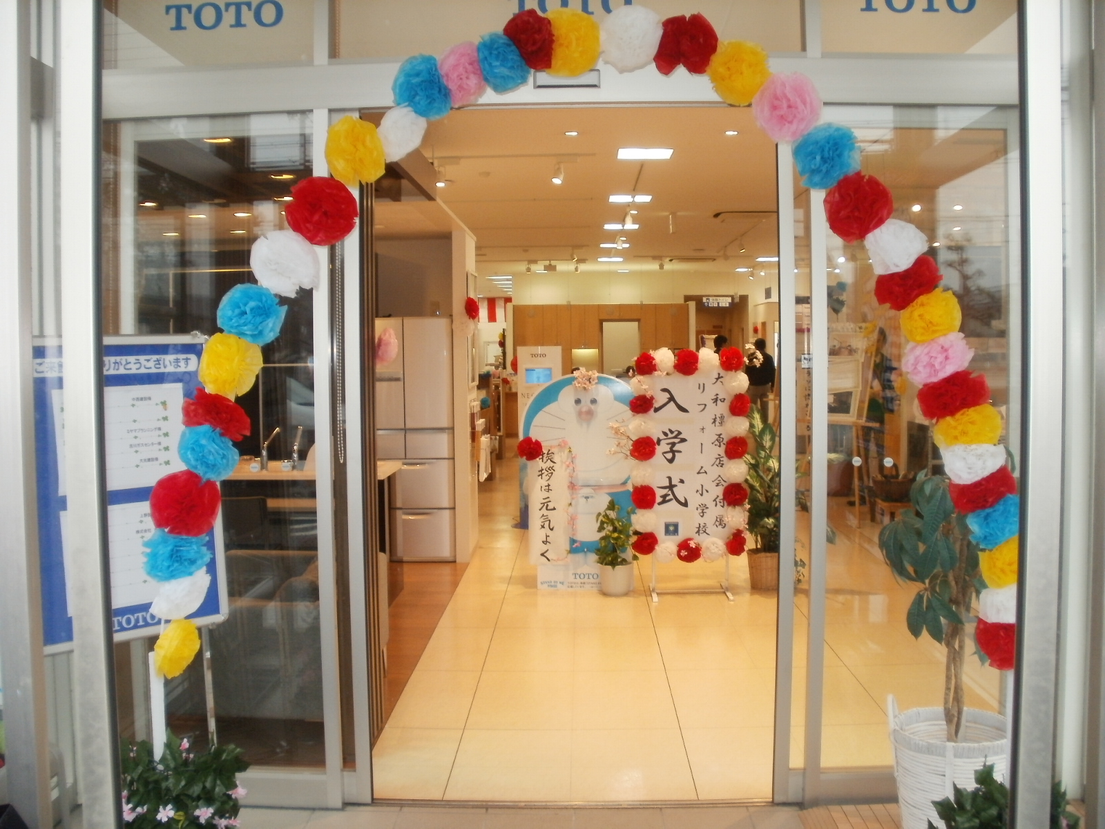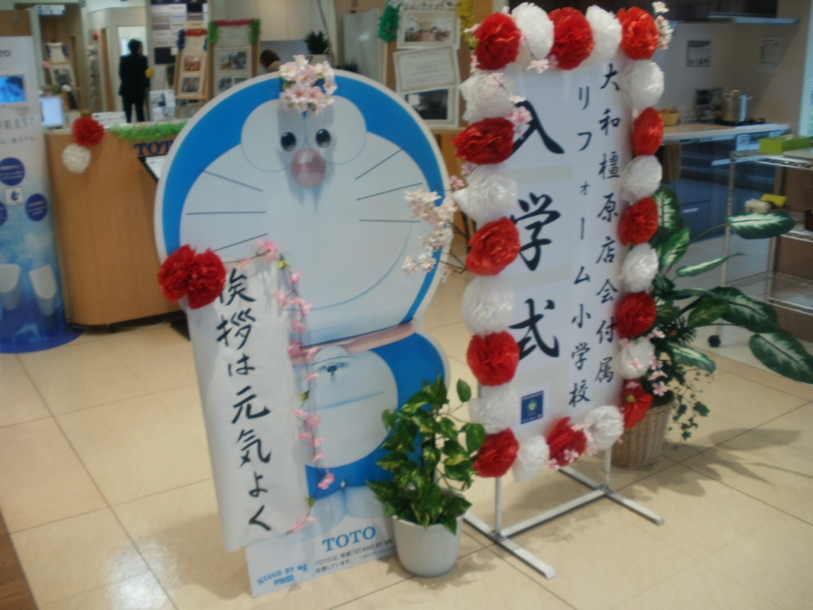 ショウルームに入ってすぐドラえもんと「入学式」の立て看板がお出迎えです。