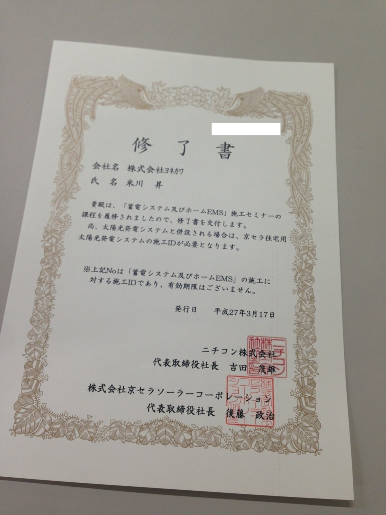 先週に行ってきました、京セラ蓄電池HEMSの施工研修のご報告です。
