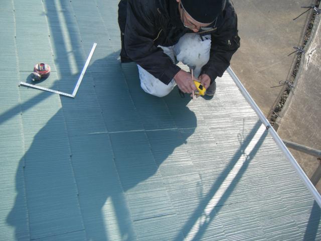 金具の取り付け位置の墨だしです。ここでパネルの土台となるベース金具の設置する位置を出します。ここは、しっかり慎重にしないといけません。