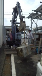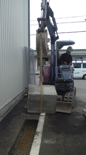パワーショベルで深さ60cm掘ります。掘った後は10cm砂利(クラッシャー)を埋め、整地(転圧)します。