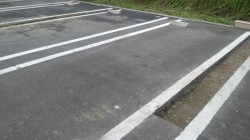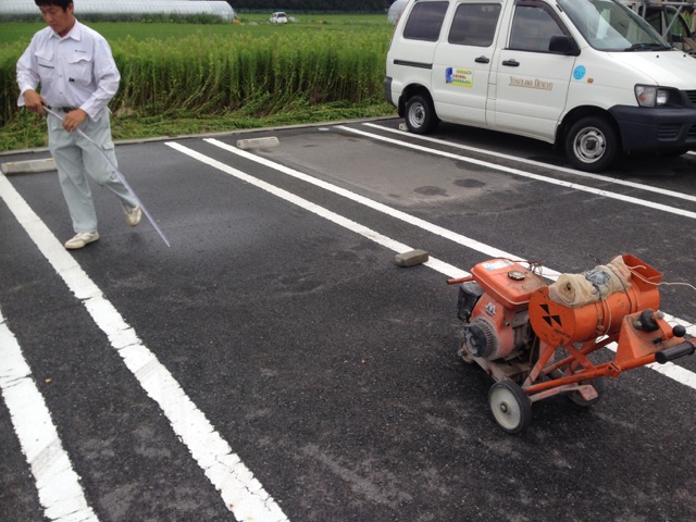 まずは、アスファルト舗装をカッター切りします。基礎を入れるのに白線の内側に沿って切ります。