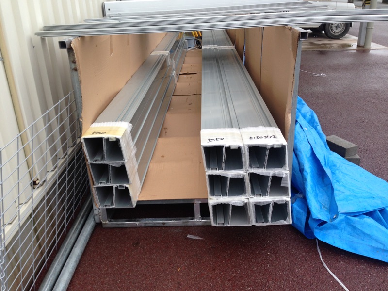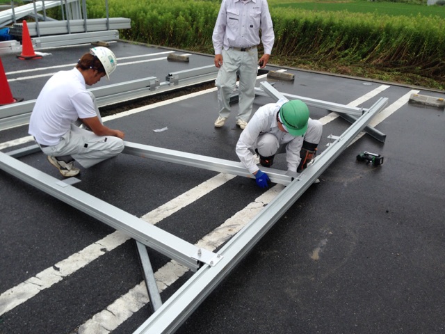 専用の厚み、太さのアルミ架台を使用します。3~4人で作業しないともてません。